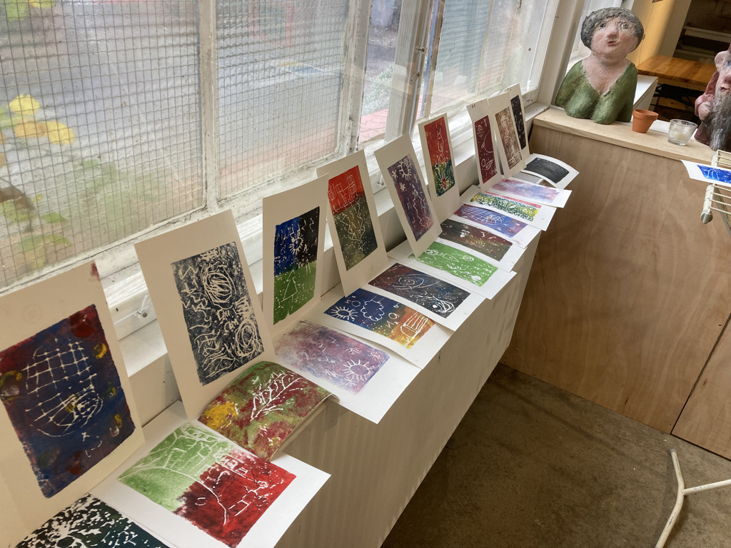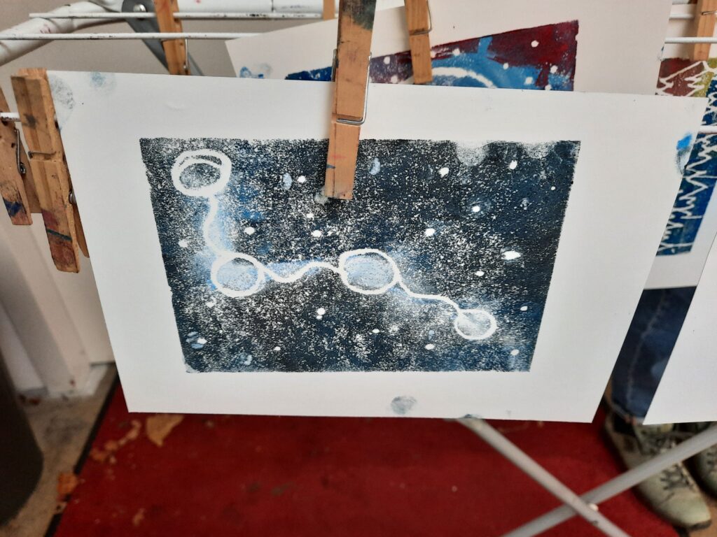 Künstlerisch wurden die Kinder von Anne Schmirler und Babette Winter begleitet. Sie führten in die Druck-Technik ein und hatten die Verzahnung mit den Leitfragen des Tages im Blick – damit das Drucken auch ein Weiterforschen ist. Zu den Themen entstanden so ausdrucksstarke, detailreiche Bilder, auch zu dem, was (zum Teil rot leuchtend) hinter den Grenzen des Universums liegen mag.