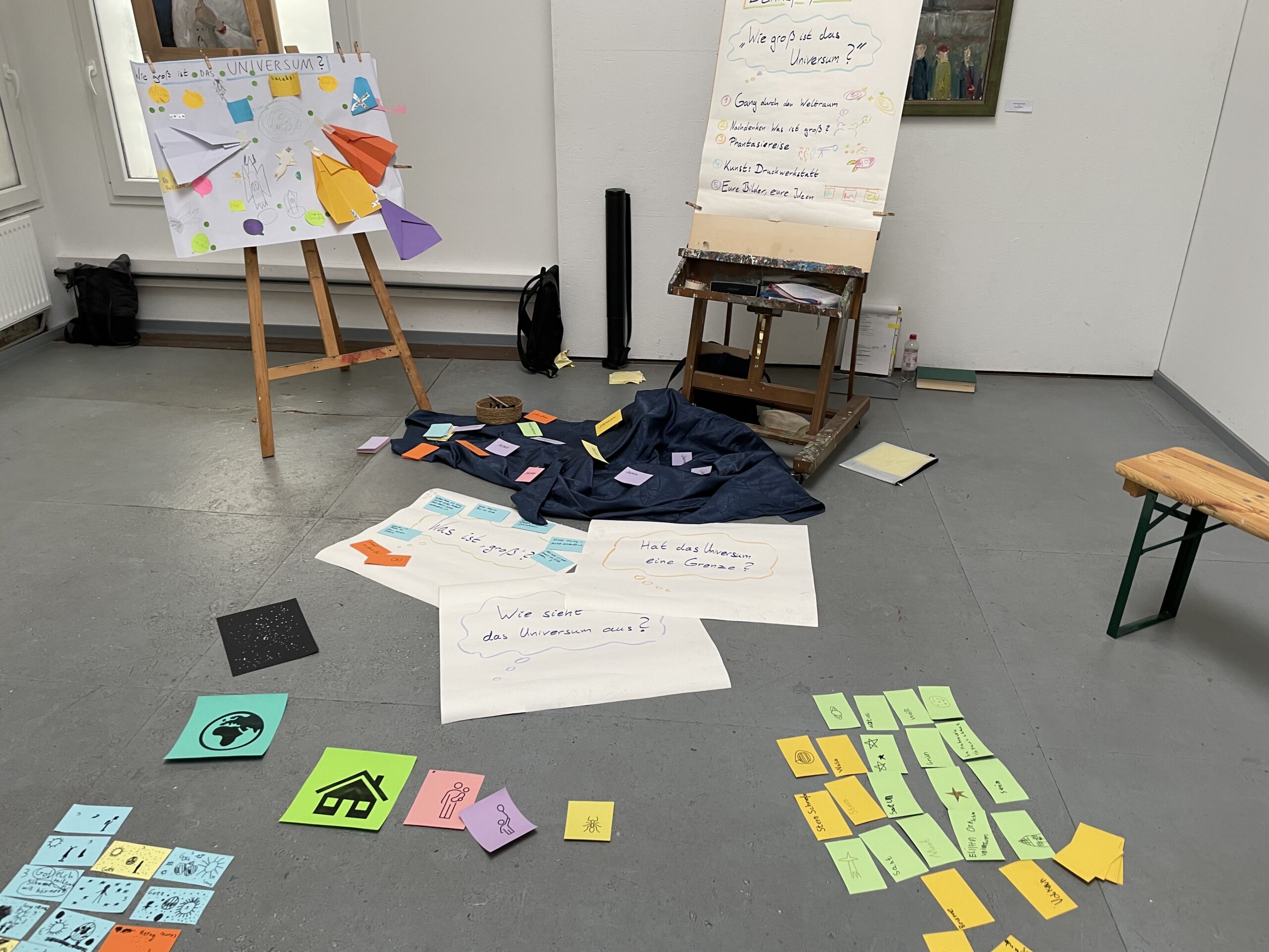 Künstlerisch wurden die Kinder von Anne Schmirler und Babette Winter begleitet. Sie führten in die Druck-Technik ein und hatten die Verzahnung mit den Leitfragen des Tages im Blick – damit das Drucken auch ein Weiterforschen ist. Zu den Themen entstanden so ausdrucksstarke, detailreiche Bilder, auch zu dem, was (zum Teil rot leuchtend) hinter den Grenzen des Universums liegen mag.