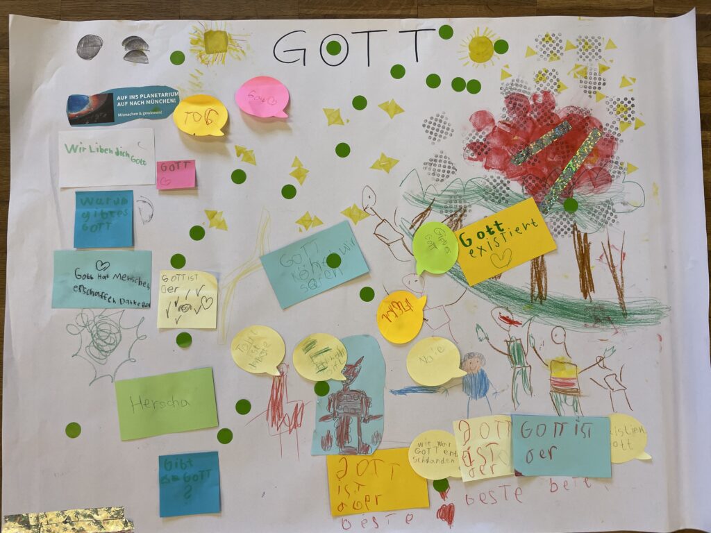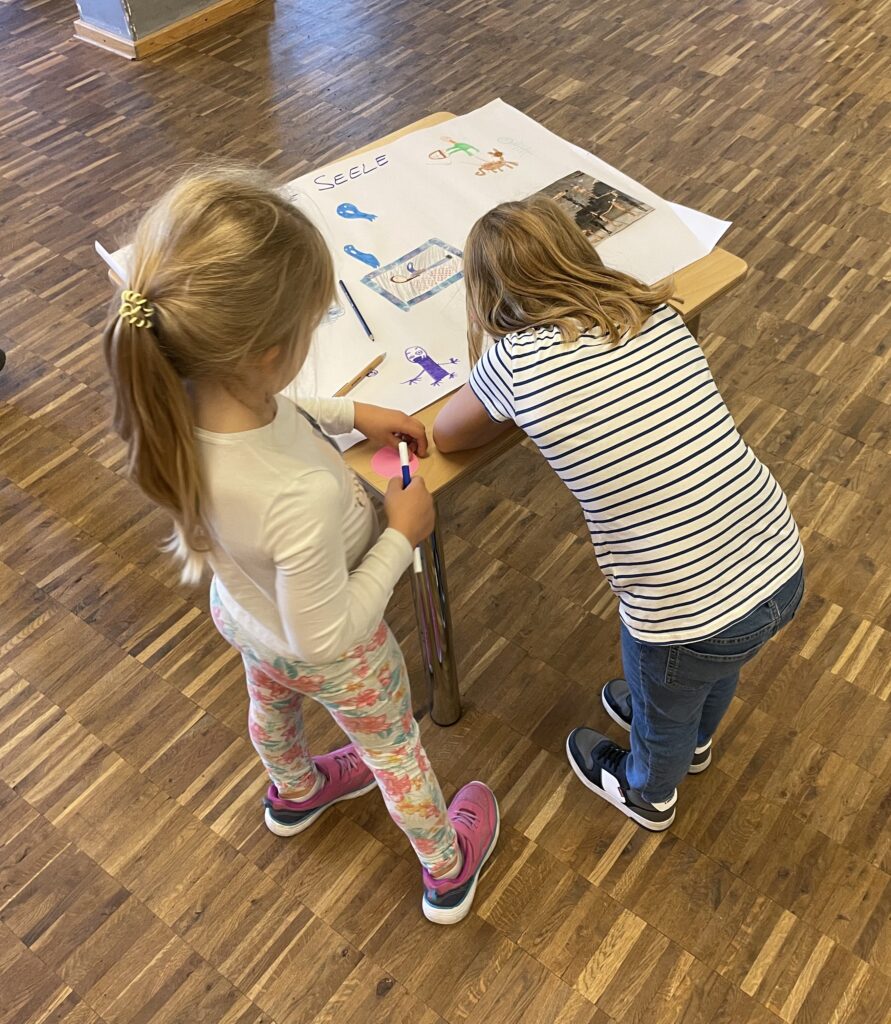Philosophisch wurden die Kinder von Martin Mettin und Eva Stollreiter, künstlerisch von Anita Fuchs und Cielo Faccio begleitet. An acht Stationen gestalteten sie Plakate zu ihren Fragen oder den ihnen übergeordneten Themen. Die Herausforderung war dabei, all das, was ihnen durch den Kopf geht, möglichst frei zu Papier zu bringen, in Form von Fragen, Gedanken, Bildern und Illustrationen, Stempeln oder auch Papierflieger. Das Motto: Alles ist erlaubt. Nach der Stationsarbeit tauchten alle nochmal ein ins theatrale Spiel, bei dem sich die Kinder in Standbildern den Themen näherten.